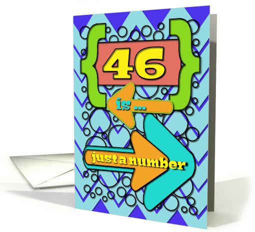Say Happy 46th Birthday with this design of bright colored arrows,chevrons,polka dots and a funny sentiment.Original digital art design by Betsy Bush of Birthday Cards Cafe'.