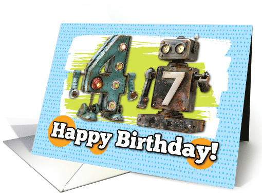 | Artist Notes: | A weathered pair of robots in the shape of the number 47 on a light-blue dotted background with white and lime-green grunge effect and the text "Happy Birthday!" in white with orange dots. A perfect card to send to that wonderful robot-loving 47-year old for their birthday. |