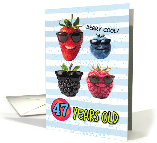 | Artist Notes: | 4 cool berries (strawberry, blueberry, blackberry and raspberrie) wearing sunglasses on a watercolor blue and white striped background with a splatter effect and the text "berry cool! 47 years old" in lime-green. A fun design for that special 47-year old celebrating their birthday. |