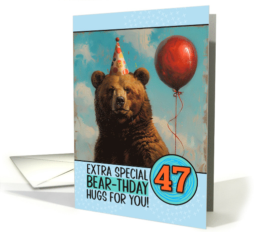 | Artist Notes: | A brown bear wearing a birthday hat and holding a red balloon on a blue background with a small pattern, the number 47 in orange, and the text "extra special bear-thday hugs for you!" A fun pun card to send to that special birthday boy or girl for their 47th birthday. |
