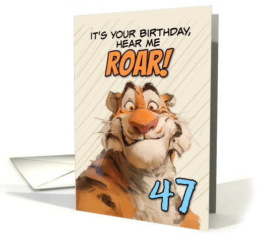 This birthday card features a cartoon-style tiger character. The tiger's face dominates the frame, wearing a friendly, slightly mischievous expression with raised eyebrows and a subtle smile. The character's distinctive features include large, expressive yellow eyes with small pupils, a broad orange nose, and visible whiskers. The illustration style is painterly and loose, with visible brushstrokes giving texture to the tiger's fur. The coloring is warm, with shades of orange, white, and brown creating the tiger's coat pattern. The background is a light cream color with faint diagonal lines running across it, which adds depth and a sense of movement to the image. At the top is the text "it's your birthday, hear me ROAR!"