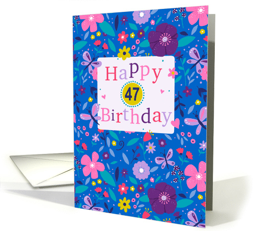 | Artist Notes: | Modern Happy 47th Birthday greetings card with lots of girly flowers of pinks, lilacs and purples on a bright blue glossy background card. ©DaleSimpson |