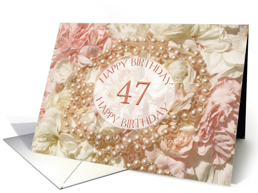 | Artist Notes: | 47th birthday greetings with pearls and petals. A beautiful way to wish a happy birthday. Pink pearls lie an a bed of pink and white petals. A very feminine card for a woman. |