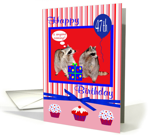 | Artist Notes: | Say Happy 47th Birthday with a card featuring two adorable raccoons holding a birthday present. Background is red, white and pink stripped with a cute bow and cupcakes. |