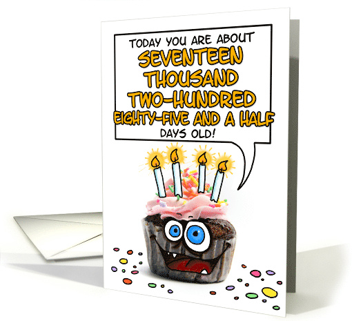 | Artist Notes: | A crazy cupcake with wild eyes, sparse teeth and glowing candles exclaims an intentionally humorous and slightly inaccurate calculation of the number of days for someone's 47th birthday. No calculators were used in the making of this card. This is NOT exact math and says "ABOUT". |