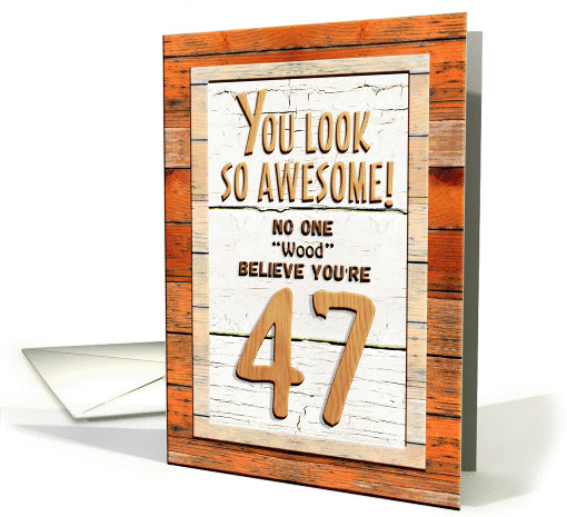 | Artist Notes: | Send funny Happy 47th Birthday greetings with this design that features an overall wood effect with a humorous sentiment based on trees and wood. Front sentiment is "You look so awesome! No one "Wood" believe you're 47" Inside sentiment is "Just don't let them count your rings. Have a tree-mendous birthday!" All wood effects are digitally created. |