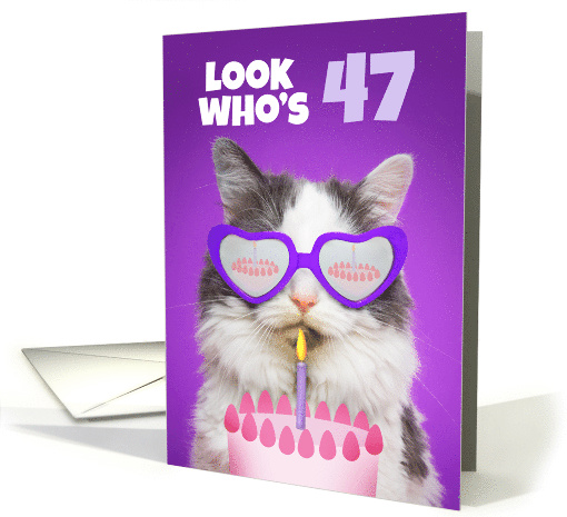 | Artist Notes: | With bold letters shouting "LOOK WHO'S 47" and a vibrant purple background, this adorable white cat wearing heart shaped sunglasses is a purr-fect way to say Happy Birthday! |