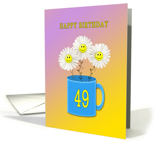 Happy smiling daisy flowers in a bright blue mug, The age 49 is in yellow on the mug. A lovely way to wish a happy 49th birthday.