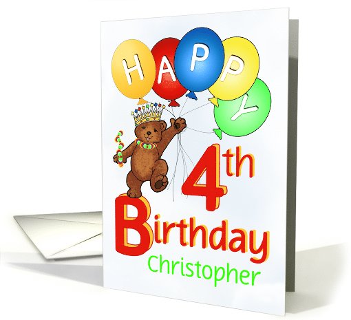 | Artist Notes: | Playful royal teddy bear wearing a princely crown of blue, yellow, red, and green jewels holding a colorful array of balloons and dancing on the birthday B is a fun happy 4th birthday card for a boy. Personalizing the card with the birthday boy's name makes it extra special. |