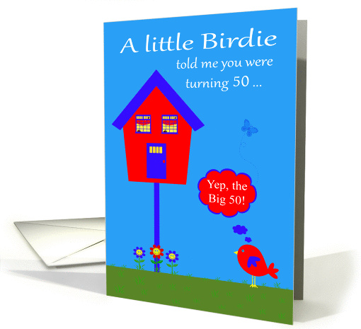 | Title: | 50th Birthday, humor, a cute bird with a talk bubble by bird house |