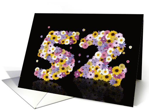 52nd birthday card. A fun birthday card with happy numbers made from daisy flowers. A great card for a beautiful lady.
