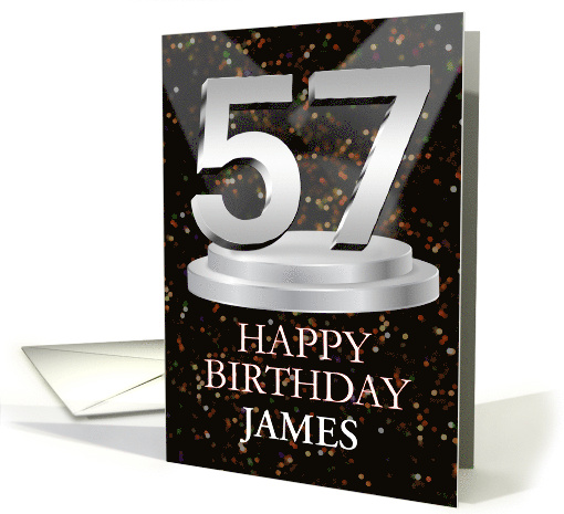 Make a 57th birthday card extra special by adding a name like James. The number 57 on a plinth with spotlights shining to light it up!