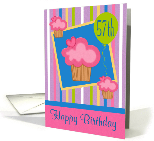 Say Happy 57th Birthday to anyone with a striped colorful design decorated with cupcakes and a balloon.