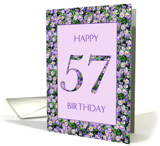57th Birthday card for a lady who likes flowers. An elegant birthday card with a background of purple daisy flowers. This is the perfect card for a girl who loves anything floral or purple!