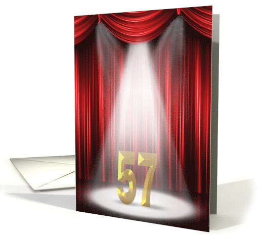 Gold 57 text in stage spotlight with red curtain backdrop for 57th birthday.