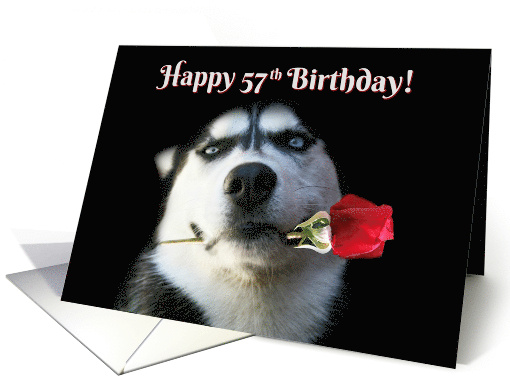 Send a cheerful birthday wish to the next 57-year-old with this playful and joyful husky holding a rose. A way to brighten their day!