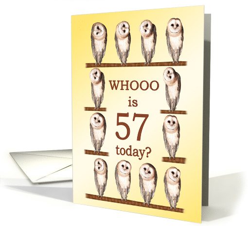 57th birthday card. Curious owls turning their heads to look at you and asking 'Who has a birthday today?'. A funny birthday card for anybody who likes owls. The owls shown are barn owls.