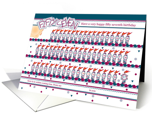 This is to wish any fifty seven year old man a very happy birthday. After, "Here is to wishes coming true. From me," write the name of the person sending the card. After, "to you," write the name of the birthday man receiving the card. I think dark turquoise(green) marker or stamp would work best.