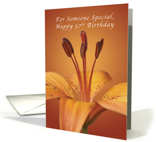 A beautiful orange daylily with a soft glowing orange background makes a card that will capture everyones attention, A wonderful card for the special person in your life celebrating their 57th Birthday.