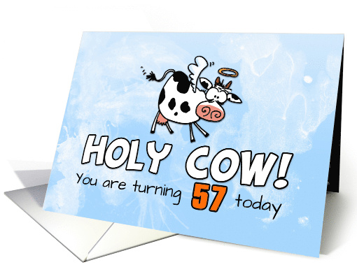 A cute cartoon cow on a sky blue watercolor background is mighty surprised and exclames "Holy Cow! You are turning 57 today". A fun design to send to your favorite fifty-seven year old.