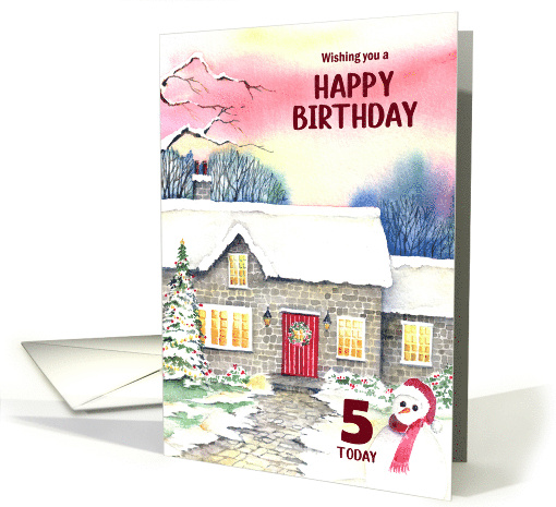 For 5th Birthday Snowman Snowy Cottage Watercolor Winter Painting