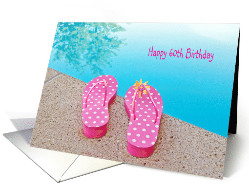 60th Birthday pink and white polka dot flip-flops by swimming pool