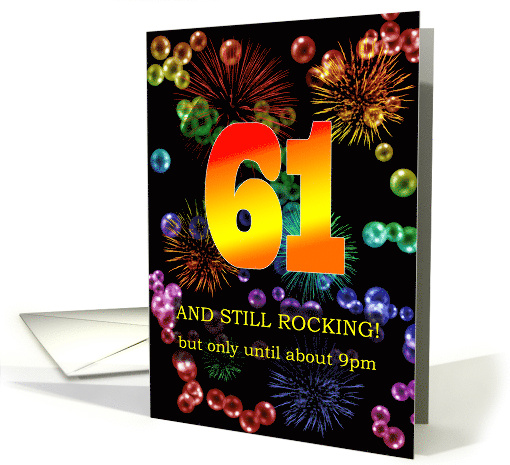 Celebrate a 61st birthday with a funny card. Still rocking, but only until 9pm has a ring of truth that will give a laugh. A great birthday card for the ageing rocker in your life.