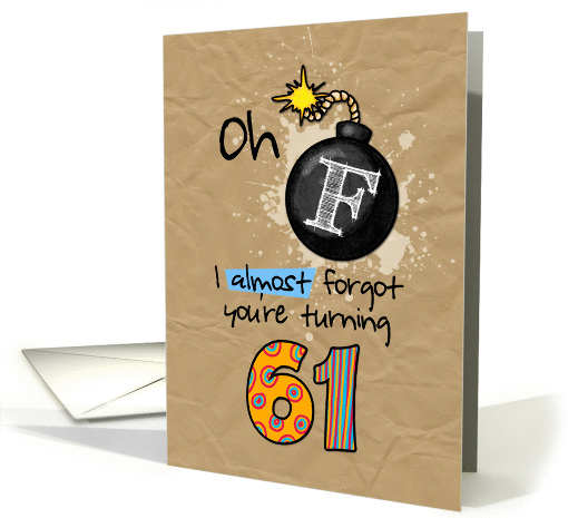 An illustration of a cartoon bomb with lit fuse of a kraft paper type background with the text "Oh F*ck I almost forgot you're turning 61"