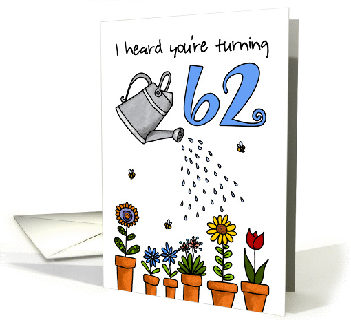 This hand drawn birthday card shows a row of colorful potted plants watered by a watering can on a white background, with a humorous punchline inside that will bring a smile to any 62 year old's face.