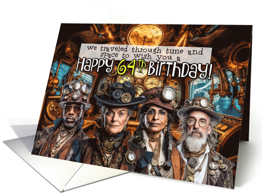 A group of Steampunk style time travellers are looking at you from their time machine with lots of steampunk detail like clockworks, gears and the elaborate fashion that goes with this subculture and the text "We traveled through time and space to wish you a Happy 64th Birthday!". A fun card to send to a 64-year old who is really into Steampunk and Fantasy.