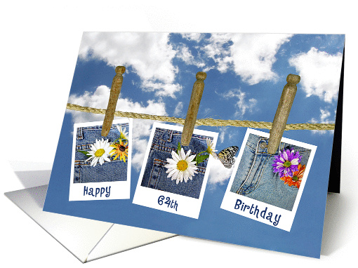Photos of daisies in blue jean pockets hanging on clothesline with old-fashioned clothespins for 64th birthday.