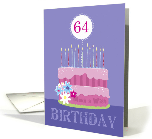 64th Birthday Cake greeting card design in Pink, set on a Purple background, with distressed style lettering, set on a glossy card. ©DaleSimpson