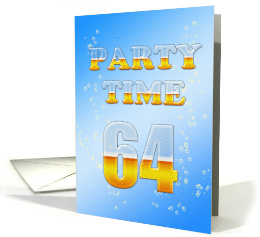 64th birthday party invitation. A funny birthday party invitation. Letters in the form of beer glasses holding lots of golden beer topped with bubbles in front of a sky blue background.