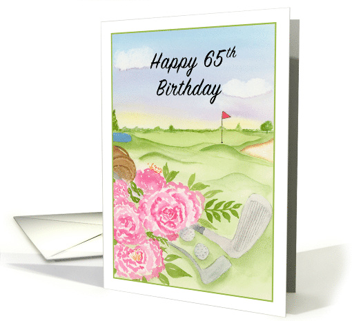 This charming, elegant watercolor card is designed for a 65th birthday, showcasing a peaceful golf course and a vintage leather golf bag filled with soft pink peonies, golf balls, and timeless clubs. Perfect for a woman who finds joy in both the game and garden, it’s a graceful tribute to her passions on this special milestone.