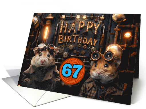 Two Steampunk style hamster scientists wearing goggles in front of their latest invention, a happy birthday machine with gears, tubes and stuff that lights up. A fun design to send to that special steampunk loving 67-year old.