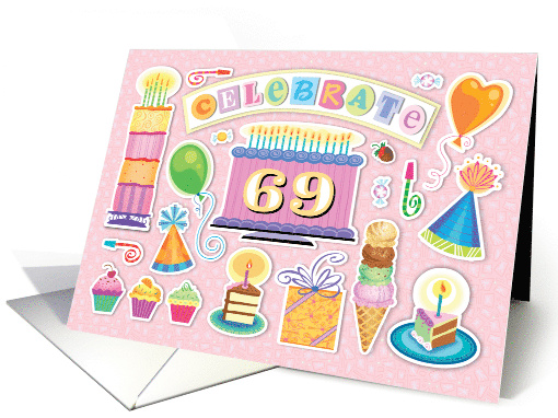 Send a 69th birthday card that's got a little bit of everything in it just to remind the birthday person what their whims could be. A pretty pink background makes all the birthday treats pop.İMindy Pierce