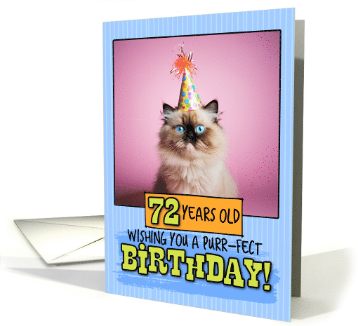 A Himalayan cat wearing a birthday hat on a light-blue andf pink background with a stripe pattern with '72 years old' in an orange box and the text "wishing you a purr-fect birthday!". A fun card to send to your favorite 72-year old for their birthday.