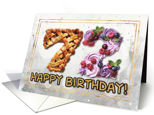 A delicious birthday applie pie, and a mixed berries and cream cake in the shape of a number 72 on a grey watercolor grunge splatter background with a gold colored trim and the text "Happy Birthday!" in a gold colored glitter effect. A perfect card to send to that wonderful 72-year old for their birthday.