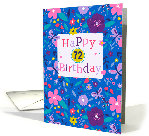 Modern Happy 72nd Birthday greetings card with lots of girly flowers of pinks, lilacs and purples on a bright blue glossy background card. ©DaleSimpson