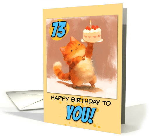 This birthday card features a charming and whimsical illustration of a fluffy orange cat standing on its hind legs. The cat is holding up a small birthday cake with one lit candle and strawberries on top. The cat has a happy, smiling expression and is wearing a small bell on a collar. At the bottom of the card, there's text that reads "HAPPY BIRTHDAY TO YOU!" with "YOU!" in large blue letters. The overall style of the illustration is soft and somewhat painterly, giving it a warm and friendly appearance. The number "73" is prominently displayed in the top left corner in blue text on a yellow circle background.