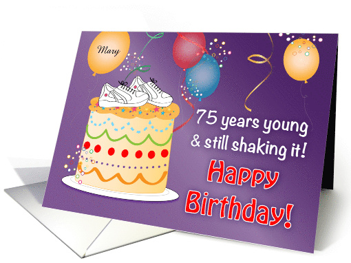 This is a custom birthday card for a dance instructor turning 75. The cover features a decorated cake, streamers, white athletic shoes, balloons, and a headline in white and red on a purple background. The personal name is placed on the top left yellow balloon. The inside message may be changed, if you wish. ©Gail Pepin