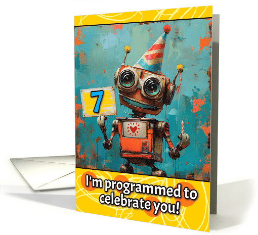 A festive little robot wearing a birthday hat painted in vibrant colors and strong brushstrokes holds up a sign and the text "7 I'm programmed to celebrate you!" on a yellow background with orange circles. A fun card to send to that special 7-year old for their birthday.