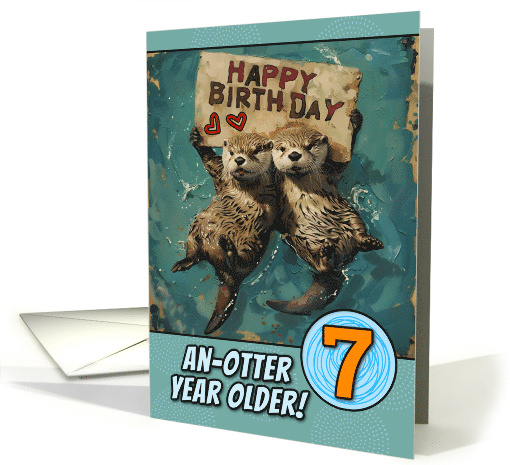 A cute otter duo floating on their backs in the water are holding up a sign that spells HAPPY BIRTHDAY on a teal background with a small pattern, the number 7 in orange, and the text "an-otter year older!" A fun pun card to send to that special birthday boy or girl for their 7th birthday.