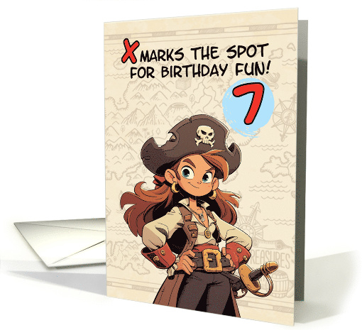 This birthday card features a charming cartoon pirate girl as the main character. She has long, flowing red hair and is wearing a large pirate hat with a skull and crossbones emblem. Her outfit includes a white shirt, dark pants, a red sash, and a belt with a large golden buckle. She's also wearing gold hoop earrings and has a sword at her side. The character has a mischievous, friendly smile. The background resembles an old treasure map with faded illustrations of islands, compasses, and sea creatures. At the top of the card, there's text that reads "X MARKS THE SPOT FOR BIRTHDAY FUN!" with the 'X' in red.