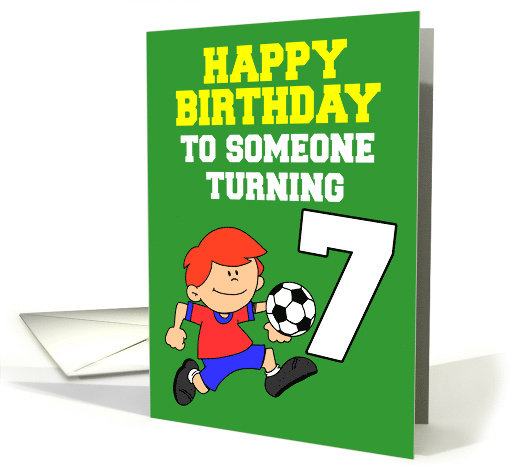 Happy Birthday To Someone Turning Seven. On the inside it says, "I hope your birthday is a real kick!" It features a cartoon, boy soccer player who is a redhead.
