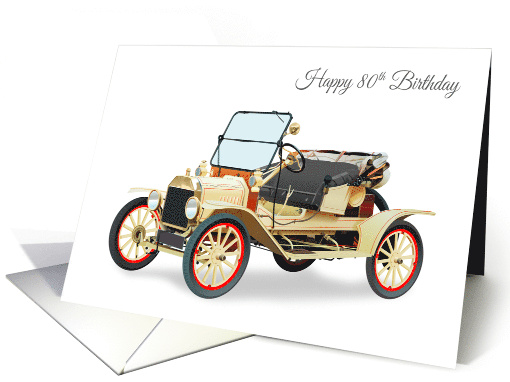 This card says Happy 80th Birthday on the front and depicts a vector graphic of a vintage 1916 American car. Built between 1908 and 1927 as a mass produced production line car, the car sold worldwide for many years and were so popular they were produced in many countries including America and Great Britain.