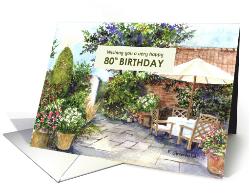 Let the beauty of a traditional English garden brighten someone's day with this lovely greeting card. Watercolor painted by Farida Greenfield, the scene captures the vibrant colors of a garden in Heslington, York, England. From blooming flowers to manicured hedges, the terrace with wooden chairs and a parasol adds a touch of relaxation. Share your well wishes with a touch of nature's beauty through this delightful card. The card design is for 80th Birthday.