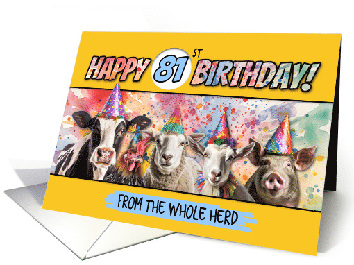 A herd of festive farm animals - a cow, chicken, sheep, goat and pig wearing party hats - have gathered to wish you a 'Happy 81st Birthday!' A fun card to send to your favorite 81-year old to congratulate them on their happy day.