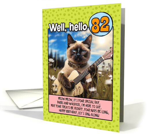 A Siamese cat playing the guitar in a meadow with flowers on a lime-green background with a dot pattern with 'well, hello 82' on the top and the text "Meow meow, it's your special day, Purrs and whiskers, I'm here to say, May your treats be plenty, your naps be long, Happy birthday, let's sing along!" A fun card to send to your favorite 82-year old for their birthday.