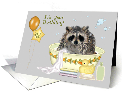 Wish anyone a Happy 82nd Birthday with a humorous card featuring an adorable, soapy raccoon in a bath tub decorated with flowers behind a stack of towels, soap dish, shampoo and a rubber ducky. Background is light gray with balloons. Inside like all GCU cards can be personalized by you if you wish.